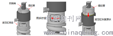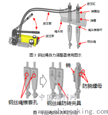 0 引言 隨著我國經(jīng)濟建設的不斷發(fā)展,高層建筑大量出現(xiàn),作為運行工具,電梯必不可少。連接在轎廂和對重上的鋼絲繩在電機的帶動下拖動轎廂運行,它是承受轎廂與對重重量、傳輸運行動力的重要部件,它的運行情況關系到電梯的舒適感、鋼絲繩和繩輪的使用壽命以及電梯的運行安全,是需要密切關注的部件。 根據(jù)載重量或型號,不同的電梯含有不同數(shù)量的曳引鋼絲繩,共同承受電梯轎廂與對重的重量,各鋼絲繩之間的張力差成為影響鋼絲繩運行情況的重要因素,《GB/T 10060 電梯安裝驗收規(guī)范》(2011)規(guī)定:“任何一根繩或鏈的張力與所有繩或鏈之張力平均值的偏差不能大于5%”,怎樣便捷快速地調(diào)整鋼絲繩的張力使其符合要求成為工程人員面臨的重要問題。 1 鋼絲繩張力調(diào)整的現(xiàn)狀 圖1為鋼絲繩繩頭側圖示,鋼絲繩的繩頭側會安裝繩頭彈簧或橡膠,由于新出廠的繩頭彈簧/橡膠的彈性系數(shù)基本相等,因此其受力后的高度可以間接反映出所受到的力的大小。傳統(tǒng)的鋼絲繩調(diào)整方法就是利用繩頭彈簧/橡膠的高度差來判斷其張力差,考慮到各彈簧/橡膠存在個體微小差異,因此允許各彈簧/橡膠存在一定的高度差,一般要求高度差不超過2mm。 使用傳統(tǒng)方法調(diào)整鋼絲繩張力的步驟如下: (1)使用螺絲刀插入相互間距很小的繩頭錐套孔,如圖2所示,阻擋螺絲刀轉(zhuǎn)動,從而防止鋼絲繩發(fā)生轉(zhuǎn)動,之后將繩頭側的防轉(zhuǎn)鋼絲繩拆掉; (2)旋松鎖緊迫母,之后根據(jù)各繩頭彈簧的高度差,對每根鋼絲繩的調(diào)整螺母進行調(diào)緊與調(diào)松作業(yè),使其高度差符合調(diào)整要求。 (3)旋緊鎖緊迫母,安裝防轉(zhuǎn)鋼絲繩,取出繩頭錐套孔中的螺絲刀。 以上傳統(tǒng)操作方法通俗易懂,但也存在一定的缺點: (1)當鋼絲繩長期處于張力不均時,繩頭彈簧/橡膠的彈性系數(shù)會發(fā)生較大變化甚至產(chǎn)生永久變形,此時僅依靠繩頭高度差進行判斷就不能準確反映張力情況; (2)電梯有多根鋼絲繩承重,當調(diào)整其中一根時,就會對其它根產(chǎn)生影響,要使所有鋼絲繩張力相等,需要反復進行調(diào)整,效率較低; (3)當電梯載重量較大或者層站較高時,人力逐根調(diào)整鋼絲繩會非常費時費力。 綜合以上特點,傳統(tǒng)調(diào)整方法存在精度差,效率低及費力的缺點,此時就需要一種較為準確的調(diào)整鋼絲繩張力的工具或方法。 2 鋼絲繩張力調(diào)整裝置設計與解析 根據(jù)以上傳統(tǒng)調(diào)整鋼絲繩的方法中不能同時精確調(diào)整的缺點,結合液壓的特點,設想是否可以利用液壓原理進行調(diào)整工具的設計。 2.1 設備原理 若將相互連通的液壓缸安裝在繩頭側,使每根鋼絲繩的拉力作用在液壓缸上,則每個液壓缸所受到的壓力應該都是相同的?;谠撛?,本文設計了一種液壓型的鋼絲繩張力調(diào)整器,其基本結構由液壓泵,液壓缸、鋼絲繩防轉(zhuǎn)裝置以及其它附件組成,原理如圖3所示。通過在鋼絲繩端部的彈簧座上設置液壓缸,液壓泵加壓使各液壓缸全部升起時,各液壓缸活塞所受的壓力相同,將各繩頭錐套桿以均等的力提拉,從而使各鋼絲繩的張力保持一致,收緊調(diào)整螺母和迫緊螺母,調(diào)整完成。 2.2 設備操作要點 以1:1吊掛的電梯為例,在使用本文中的鋼絲繩張力調(diào)整裝置時,相關操作要點及步驟如下: (1)在轎廂側/對重側安裝鋼絲繩防轉(zhuǎn)裝置,以防作業(yè)過程中出現(xiàn)鋼絲繩轉(zhuǎn)動進而使鋼絲繩從繩頭板中脫出,如圖4。 (2)稍微擰松鎖緊迫母,將液壓缸底座、液壓缸依次放在彈簧座上,之后用可以壓緊液壓缸活塞的帶螺紋的提拉管進行鎖緊,在繩頭螺桿上安裝防脫銷。如圖5。 (3)使用液壓泵對液壓缸進行加壓,當所有液壓缸的活塞都升起時且提升高度均小于(不能等于)活塞的提升范圍時,說明各鋼絲繩張力調(diào)整均勻。 (4)作業(yè)人員用手通過液壓缸底座小窗向下旋緊調(diào)整螺母及鎖緊迫母,之后拆掉防脫銷、提拉管以及液壓缸和液壓缸底座,裝回防轉(zhuǎn)鋼絲繩。 注意:液壓缸加壓時,可能會出現(xiàn)某幾個活塞已經(jīng)提升至最大行程,但仍有部分液壓缸未升起的情況,此時對于已經(jīng)提升的活塞,錐套桿會被相應的提拉,因此調(diào)整螺母及鎖緊迫母也會被提拉,作業(yè)人員可以用手通過液壓缸底座上的小窗向下擰緊調(diào)整螺母及鎖緊迫母,如圖6,之后松開提拉管,按壓液壓缸活塞使其恢復原狀后,如圖7,再重新鎖緊提拉管,重復之前的步驟進行加壓提升液壓缸,直至所有液壓缸活塞都升起,且行程都小于(不能等于)活塞的最大行程。 2:1吊掛的電梯在轎廂和對重側調(diào)整完畢后,由于中部鋼絲繩可能“積氣”,最好電梯上下運行幾次,再重復以上步驟進行調(diào)整。轎廂和對重側同時調(diào)整效果更好。