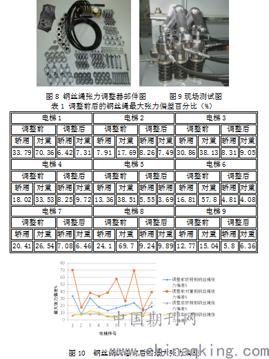 圖5 圖6 圖7 3 開發(fā)實物及測試效果 按照開發(fā)思路所設計出的鋼絲繩張力調(diào)整器及相關附件如圖8所示。 依據(jù)本文第二部分所述使用方法,使用本裝置對10臺電梯的鋼絲繩張力在轎廂和對重側分別進行調(diào)整(先調(diào)整一側,再調(diào)整另一側),調(diào)整后使用張力計對各鋼絲繩張力進行測試,本測試旨在驗證本套設備的有效性,因此對轎廂和對重側只進行了一次調(diào)整,并未使電梯運行幾次后再次進行調(diào)整。圖9為現(xiàn)場調(diào)整圖,表1為各電梯調(diào)整前后各鋼絲繩張力與平均張力之間的最大偏差百分比,對應圖示如圖10。 從表1和圖10可以得出以下結論: (1)使用鋼絲繩張力調(diào)整器進行調(diào)整,是直接以張力大小為調(diào)整依據(jù),調(diào)整精確,張力不均的情況改善十分明顯; (2)一次可調(diào)整多條鋼絲繩,效率提高; (3)調(diào)整時以液壓為動力進行調(diào)整,節(jié)省人力。 需要指出的是:以上測試是一側調(diào)整后再調(diào)整另外一側,由于鋼絲繩張力調(diào)整器是根據(jù)不同的張力向繩頭側提拉不同的距離來實現(xiàn)張力平衡的,當提拉其鋼絲繩時,繩輪處的鋼絲繩會發(fā)生移動或滑動,因此后調(diào)整的一側會對先調(diào)整的一側產(chǎn)生影響,使已經(jīng)調(diào)好的一側張力發(fā)生變化。 4 總結 通過以上介紹及現(xiàn)場實物操作效果分析,可得出以下結論: (1)鋼絲繩張力調(diào)整器調(diào)整效果明顯,最大張力偏差下降明顯; (2)鋼絲繩張力調(diào)整器是直接調(diào)整張力大小,調(diào)整效果精確,而彈簧/橡膠高度只是張力的一種間接表現(xiàn),精度有限,是一種粗略的調(diào)整方法; (3)當電梯鋼絲繩張力長期偏差較大時,可能會超過彈簧/橡膠的彈性極限,產(chǎn)生永久變形,因此其高度不能作為精確調(diào)整的標準; (4)對于張力偏差較大的鋼絲繩,人工粗略調(diào)整后,再進行鋼絲繩張力調(diào)整器的精調(diào),會大大提高工作效率。 由于該裝置是直接調(diào)整鋼絲繩的張力,因此避免了人工通過觀察彈簧高度間接調(diào)整鋼絲繩張力所可能引起的不準確;同時,該裝置通過液壓缸頂起繩頭錐套桿,可以手動輕松旋緊調(diào)整螺母,大大降低了勞動強度,是鋼絲繩張力調(diào)整的有效工具。