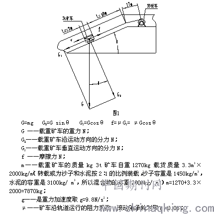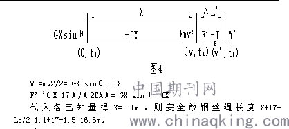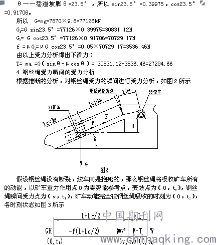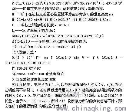 W =mv2/2= GX sinθ- fX F’2(X+17)/(2EA)= GX sinθ- fX 代入各已知量得X=1.1m,則安全放鋼絲繩長(zhǎng)度X+17- Lc/2=1.1+17-1.5=16.6m。 結(jié)論 假設(shè)不成立,鋼絲繩吸收不了斷裂前礦車在斜坡上運(yùn)動(dòng)的所有動(dòng)能,所以鋼絲繩斷裂,發(fā)生了跑車事故。質(zhì)量7870kg的載重礦車后輪離開變坡點(diǎn)前,必須在絞車的牽引力作用下勻速緩慢下放。